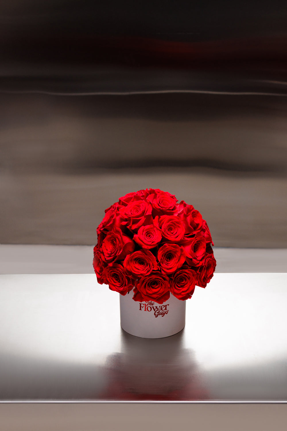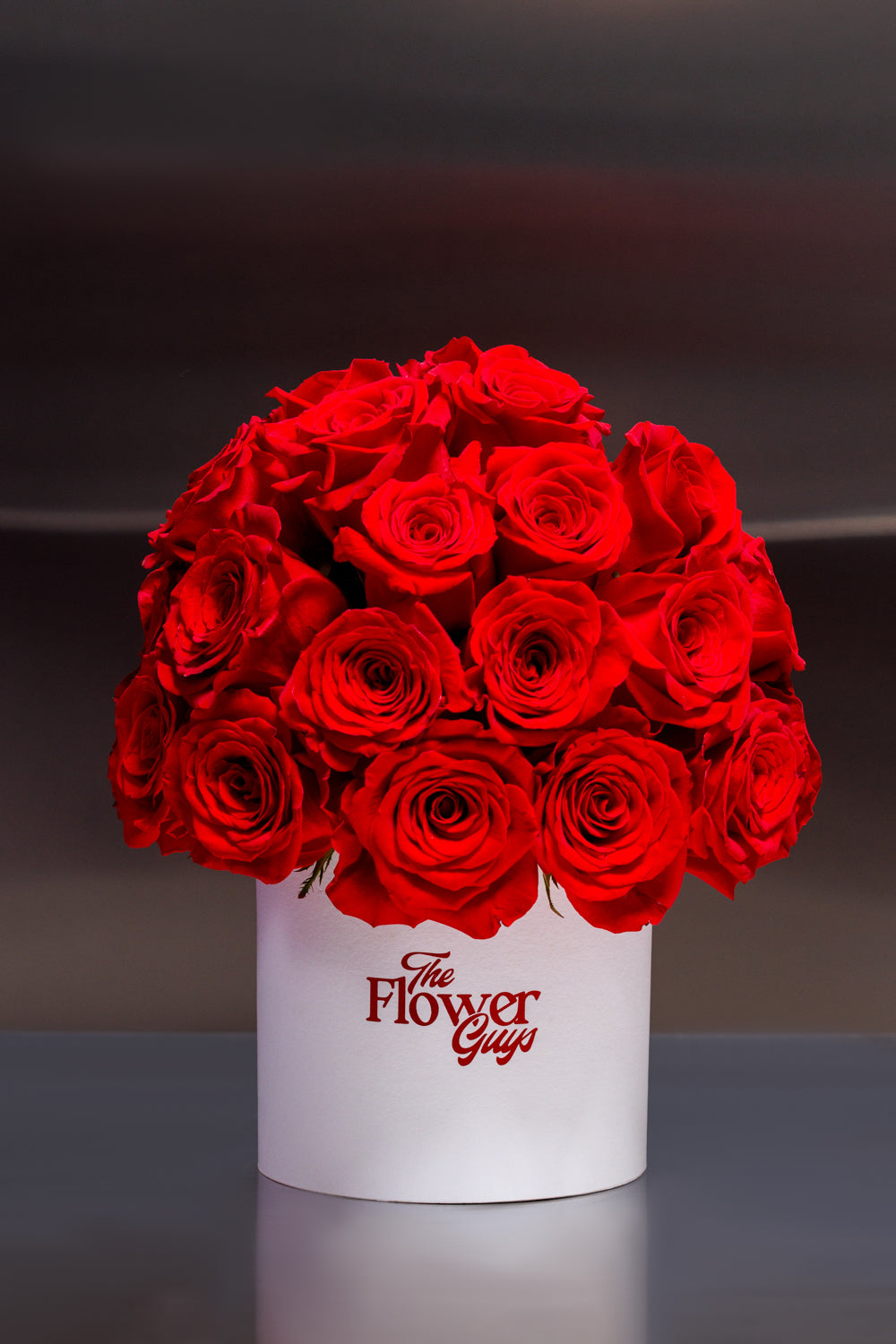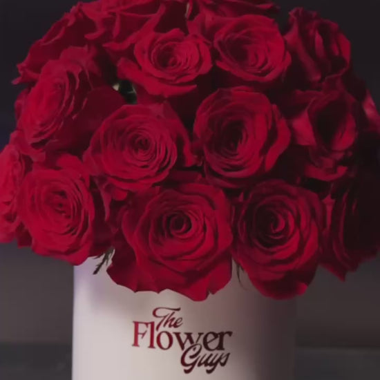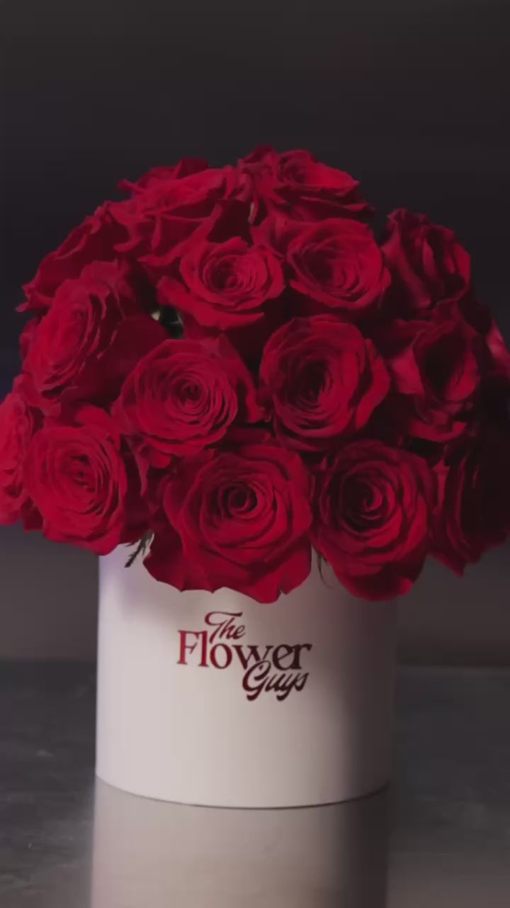 Our Cupid’s Arrow arrangement contains 30 premium red roses in a high-volume dome that spills over the edges of our signature Large Hatbox. This centerpiece commands the room and radiates passion.